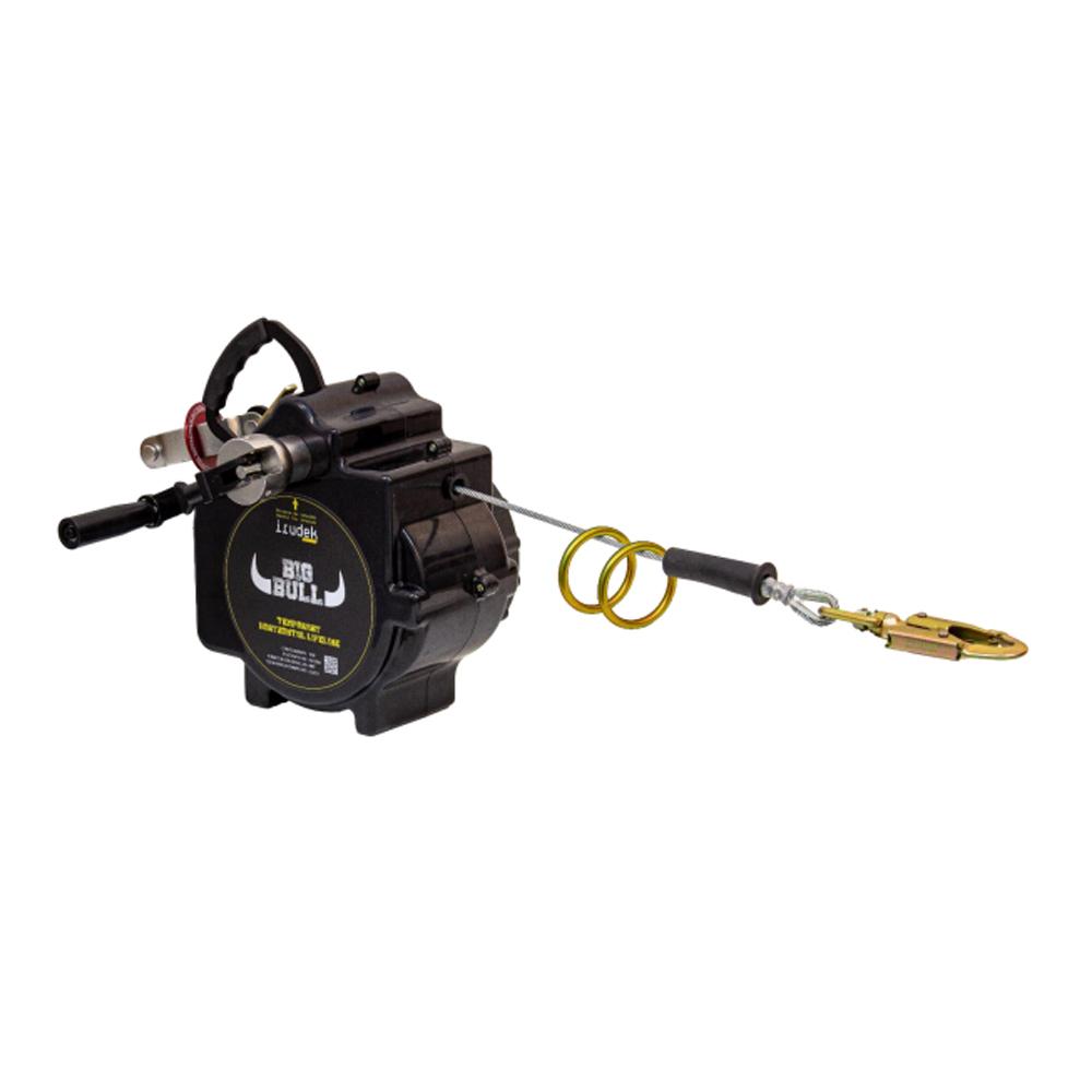 Línea de vida temporal horizontal de cable para el uso de 2 usuarios simultáneos. Dispone de indicador de tensión para asegurar la tensión correcta del equipo en la instalación, además de incluir un conector quita vueltas con indicador de caída en uno de los extremos para evitar trenzados del cable. Dispone de palanca para un fácil y rápido retractilado del cable en la recogida. También incluye 2 aros de conexión a la línea. Regulable de 1m a 18m.