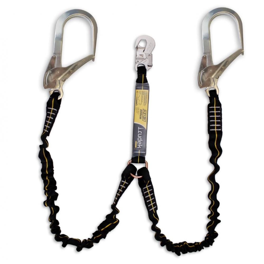 Absorbedor de energía con cinta elástica y ganchos de aluminio de gran abertura. Diseñado para soportar caídas. Reduce el impacto de la caída por debajo de 6 kN.Distancia de parada de 1m, a sumar a la longitud total del sistema.